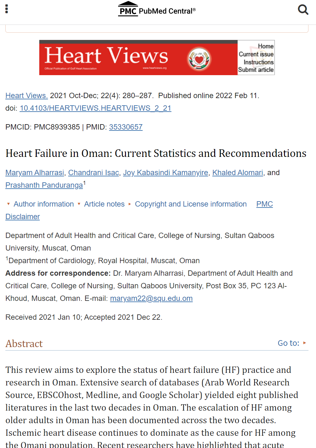 The article states that Heart failure (HF) is a growing epidemic in Oman, affecting a younger population compared to the West. The prevalence has doubled since 2001, reaching 1000 new cases yearly, with an increasing trend among those over 60. Common comorbidities include hypertension, coronary artery disease, and diabetes. Ischemic heart disease is the primary cause. Noncompliance with medication, delayed presentation, and metabolic syndrome contribute to HF development. In-hospital mortality ranges from 4.3% to 6.2%, with a 50% rehospitalization rate at 12 months. The findings emphasize the need for health promotion, preventive services, and dedicated research in Oman to address the rising burden of HF.